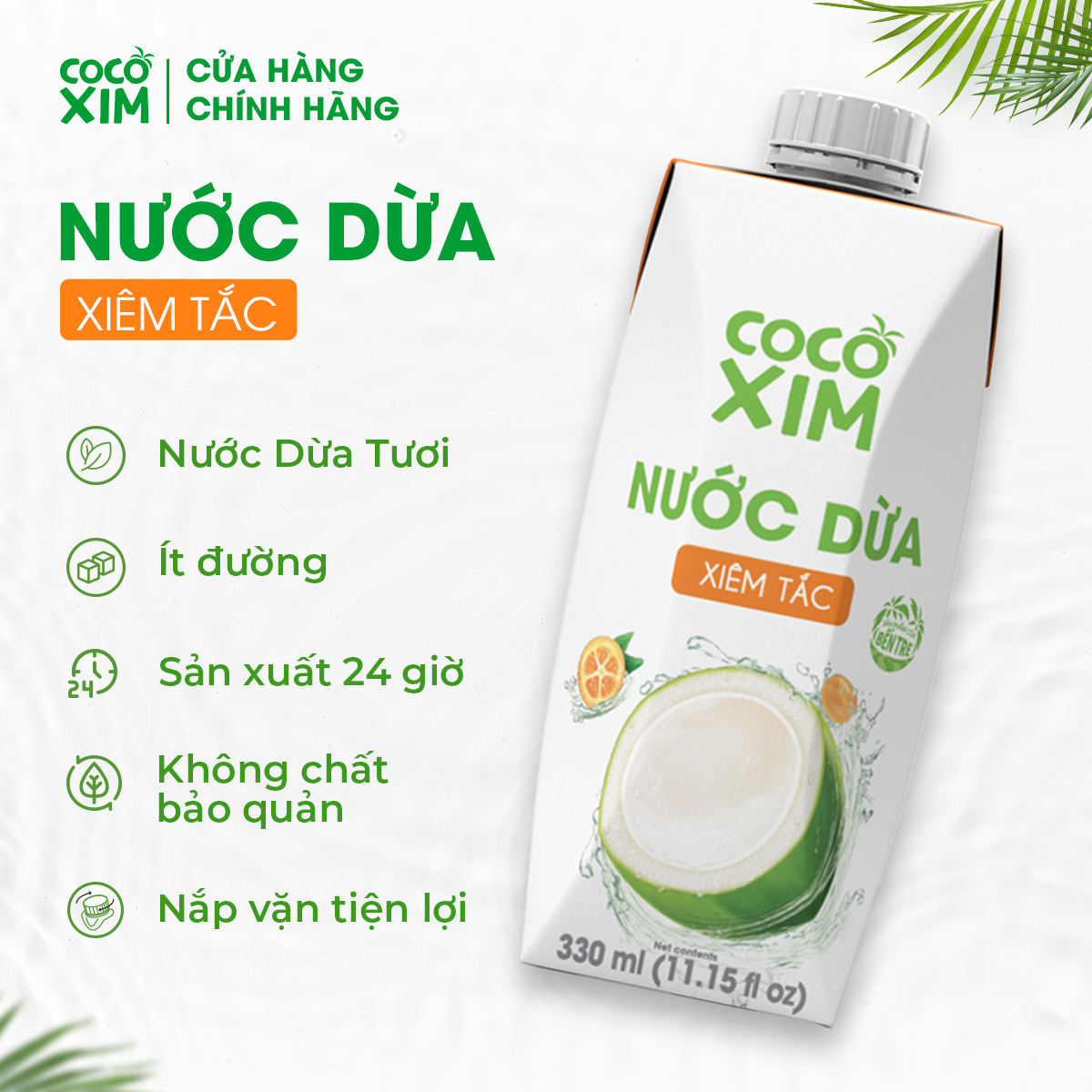 Sự kết hợp giữa nước dừa tươi nguyên chất Bến Tre cùng nước ép tắc đem đến một thức uống giải nhiệt tuyệt vời hoàn toàn tự nhiên! Dừa Xiêm Tắc giúp bạn đánh tan nhanh cơn khát, bổ sung các khoáng chất thiết yếu cho cơ thể để bạn luôn dồi dào năng lượng! Sản phẩm sản xuất trên dây chuyền công nghệ hiện đại của Tetra Pak giúp giữ trọn hương vị tự nhiên và dưỡng chất của dừa. Hoàn toàn không sử dụng chất bảo quản và chất tạo màu, không làm từ nước dừa cô đặc. Quy cách đóng gói:Hộp giấy tiện lợi 330mlThùng 12 hộp Hướng dẫn bảo quản: Bảo quản nơi khô ráo và thoáng mát.Hướng dẫn sử dụng: Ngon hơn khi uống lạnh. Sau khi mở nắp, nên bảo quản lạnh và sử dụng hết trong vòng 24 giờ. Màu nước dừa có thể thay đổi theo thời gian. Thời hạn sử dụng: 15 tháng kể từ ngày sản xuất
